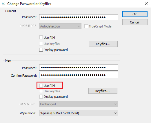 The PIM of a volume or for system encryption can be changed or cleared using the change password functionality. The screenshots below shows an example of changing the PIM from the empty default value to a value equal to 3 (this is possible since the password