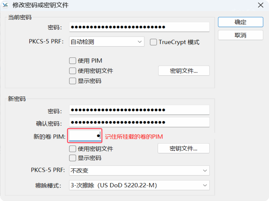 在创建卷或更改密码时,用户可以通过选中“使用PIM”复选框来指定PIM值,这样GUI中会显示一个PIM字段,用户可以输入PIM值。