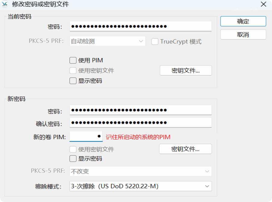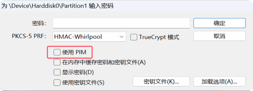 PIM被视为一个秘密值,每次用户都必须与密码一起输入。如果指定了错误的PIM值,挂载/引导操作将失败。