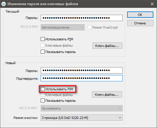 PIM тома или для шифрования системы можно изменить или очистить с помощью функции смены пароля.